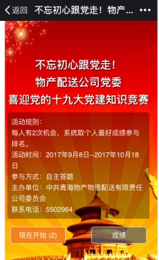 (物產(chǎn)配送公司 訊 龐玲/文)為了迎接黨的十九大勝利召開,物產(chǎn)配送公司黨委在9月8日-10月18日期間開展"喜迎黨的十九大"微信公眾平臺黨建知識答題活動。