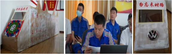 西柏坡精神是部生動的教科書,車間工人黨員袁有德利用平時(shí)裝配件的紙盒子,創(chuàng)意性地制做了一列"團(tuán)結(jié)奮進(jìn)號"火車,邀請黨員一起乘車前行。袁有德說:"團(tuán)結(jié)奮進(jìn)號"列車蘊(yùn)含著學(xué)習(xí)西柏坡精神,強(qiáng)企富家、團(tuán)結(jié)奮進(jìn)的寓意,車頭前面的"大眾"標(biāo)識代表公司經(jīng)營的品牌;八個(gè)綠色的大美孚機(jī)油蓋代表八方來財(cái),所有蓋口都向外代表招攬客戶,減少流失,而且像螺絲釘一樣牢牢釘??!車頭車尾標(biāo)有"勿忘來時(shí)路"的字樣,以此提醒廣大黨員干部不忘初心、牢記使命,一定不要忘記來時(shí)的路,回顧過去,展望未來,讓"團(tuán)結(jié)奮進(jìn)"號列車在西柏坡精神的感召下前行。支部要求,在疫情防控和汽車行車嚴(yán)竣的形勢下,我們每一個(gè)物產(chǎn)汽貿(mào)員工都是新時(shí)代的答卷者,讓"團(tuán)結(jié)奮進(jìn)號"奔馳在新時(shí)代的征程上,承載著中國夢、物產(chǎn)夢,承載著物產(chǎn)汽貿(mào)職工群眾對美好生活的向往,風(fēng)馳電掣,勇往直前,奔向未來!