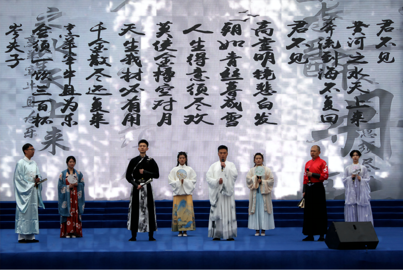 青物書院為搞好此次活動,確保節(jié)目精益求精,組織集團系統(tǒng)職工高凱、郭宇、阿柏林、任蕊、王思涵等8名員工排練了富有特色的詩樂鳴響《將進酒》。在演出現(xiàn)場,悠揚婉轉(zhuǎn)的古箏配上鏗鏘有力的誦讀,將詩仙李白的傳統(tǒng)經(jīng)典賦予了新的形式,煥發(fā)出新的光彩,將活動現(xiàn)場推向了高潮,現(xiàn)場掌聲雷動,展現(xiàn)出了青海物產(chǎn)集團職工奮發(fā)向上的精神風貌,塑造了青海物產(chǎn)書香企業(yè)的良好形象。